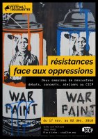 Dans une période sombre de montée des idéologies réactionnaires, le CICP a souhaité faire de ce Festival des Solidarités un moment de mise en lumière et de partage autour de nos, de vos résistances face aux oppressions, du local au global, d’une lutte à l’autre. Les associations du centre vous proposent d’échanger sur la nécessité des résistances numériques, aux frontières, dans l’éducation, des luttes féministes comme fer de lance des mouvements de résistance, des enjeux de la coopération sécuritaire française, ou encore de la situation des enfants palestiniens dans la bande de Gaza.